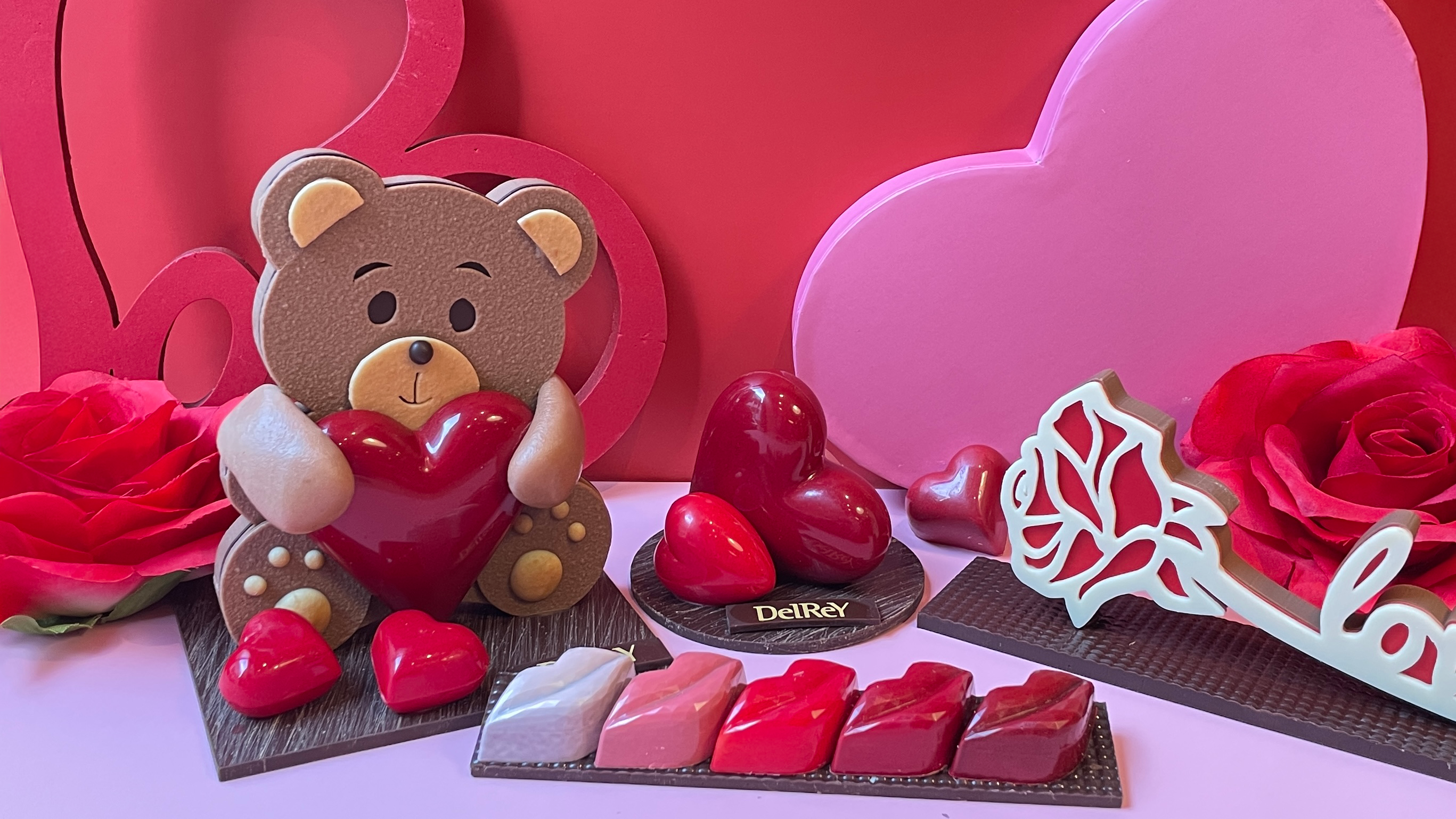 Van schattige chocoladebeertjes en chocolade rozen die nooit verwelken tot love puzzels om samen te ontdekken, klassieke hartjes en lippen in chocolade.